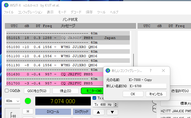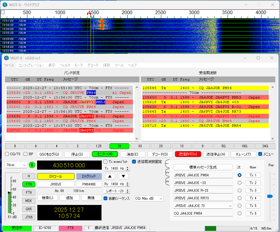IC-9700+WSJT-Xで交信した画面を載せておきます。