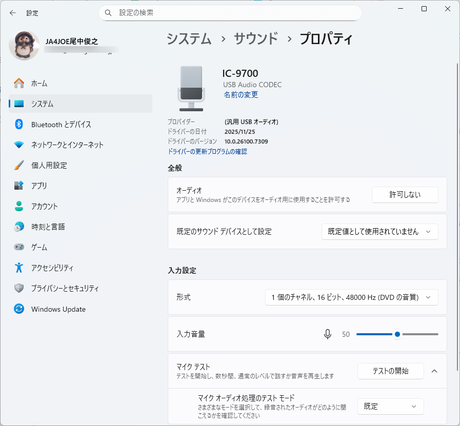 私の環境ではスピーカー 2-USB Audio CODECとマイク 2-USB Audio CODECになりました。どちらも、名前を「IC-9700」に変更しました。