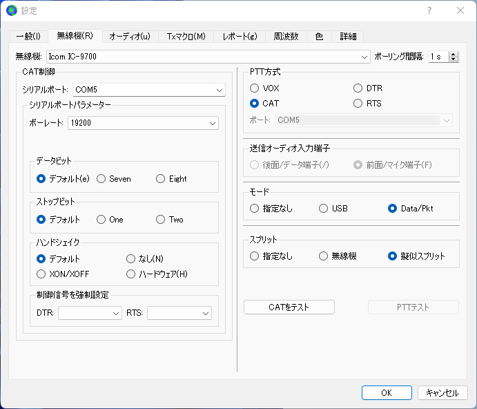 上記までの設定後に[OK]を押していったん設定終了後に、[CATをテスト] ボタンをクリックして緑色になれば CATによるIC-9700の制御が出来ています。