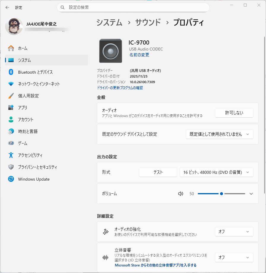 設定はIC-7300Mと同じで、出力のボリュームを50%としました。「オーディオの強化」、「立体音響」はオフにします。