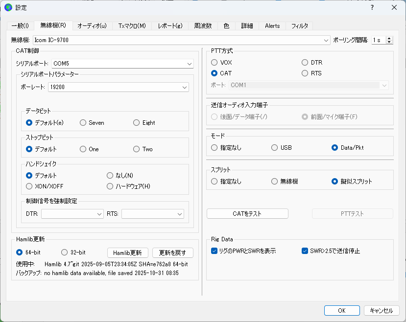 [ボーレート] IC-9700では19200bpsが最大なので19200にしました。