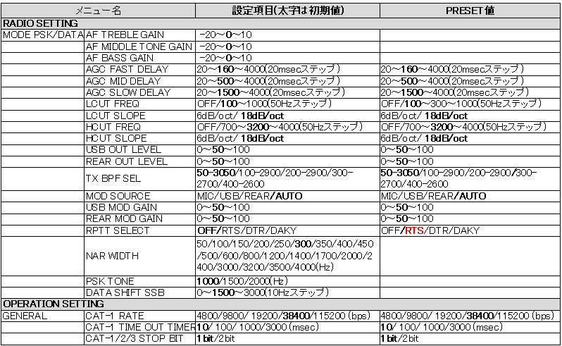 ただ、PRESETだとSSBやCWの設定も変わるようなので、DATA-Uモード(MODE PSK/DATA)のみにPRESETと同じ設定をする事にしました。