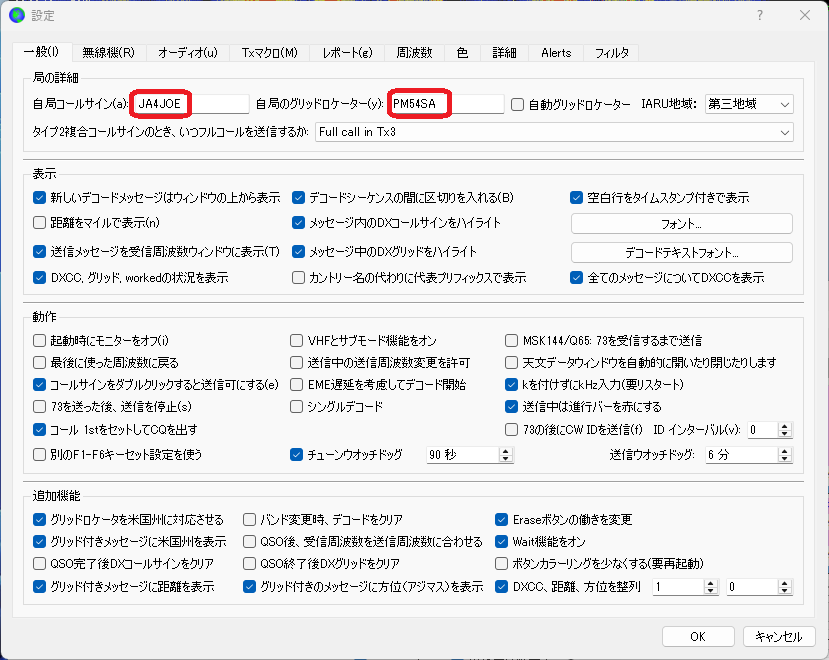 [一般]の設定はコールサイン、グリッドロケーターを設定します。