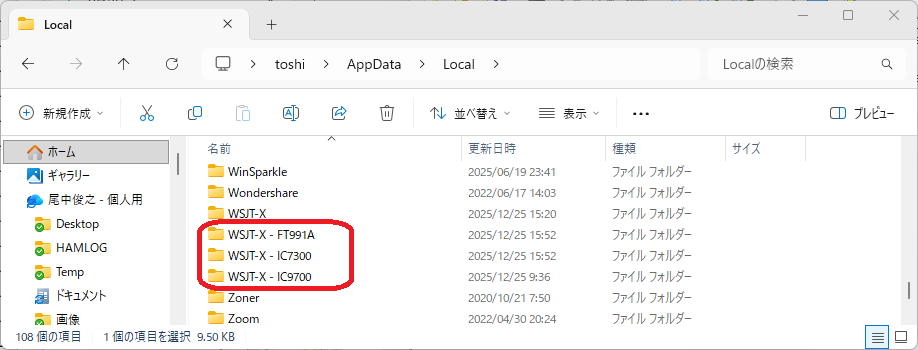 C:\Users\XXXXX\AppData\Local\ (XXXXXはユーザー名)の中に「WSJT-X - IC7300」というフォルダーが作られます。