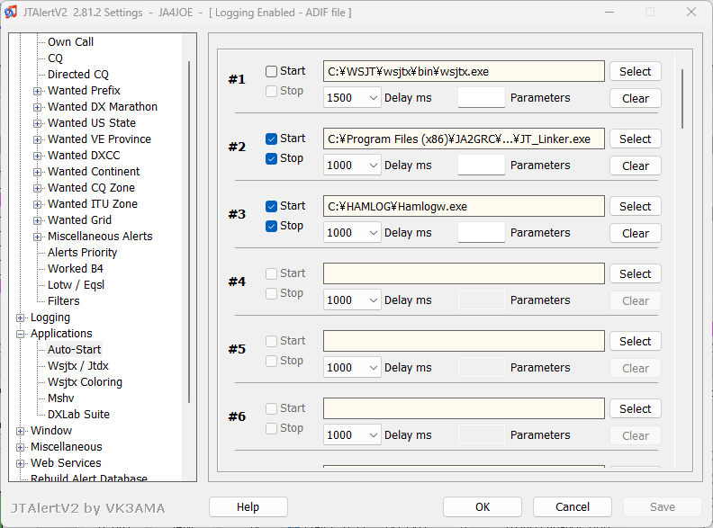 WSJT-Xの自動起動はバッチファイルで行うので(後述)、JTAlertからのWSJT-Xの自動起動は停止します。JT_LinkerとHamLogwは2つ目のJTAlert起動時に2重起動になりそうですが問題無いようなので、このままにしました。