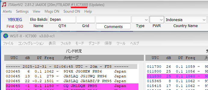 最初にIC-7300とFT-991AM のWSJT-X+JTAlert同時起動時の画面例です。