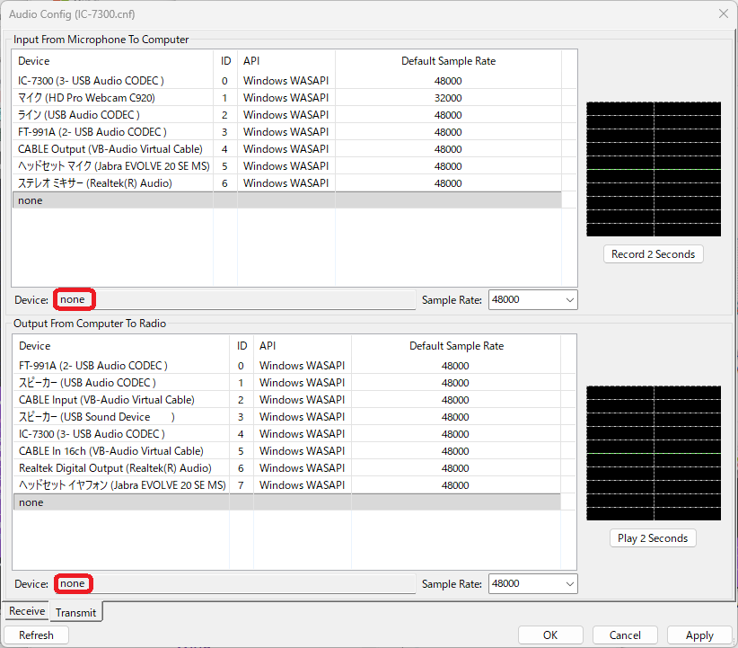 (KiwiSDRを受信して送信もしたい場合は、[Transmit]タブの設定は変更しないでください。)