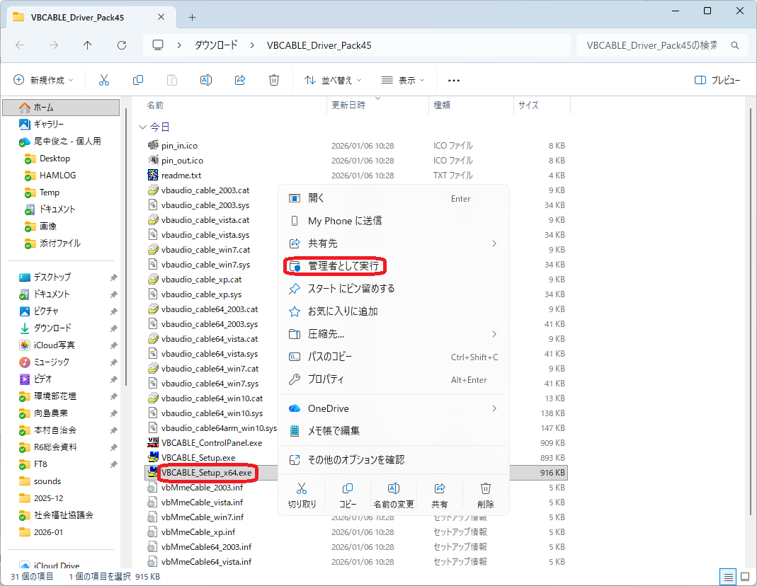 ダウンロードしたVBCABLE_Driverを解凍してVBCABLE_Setup_x64.exeを管理者として実行します。