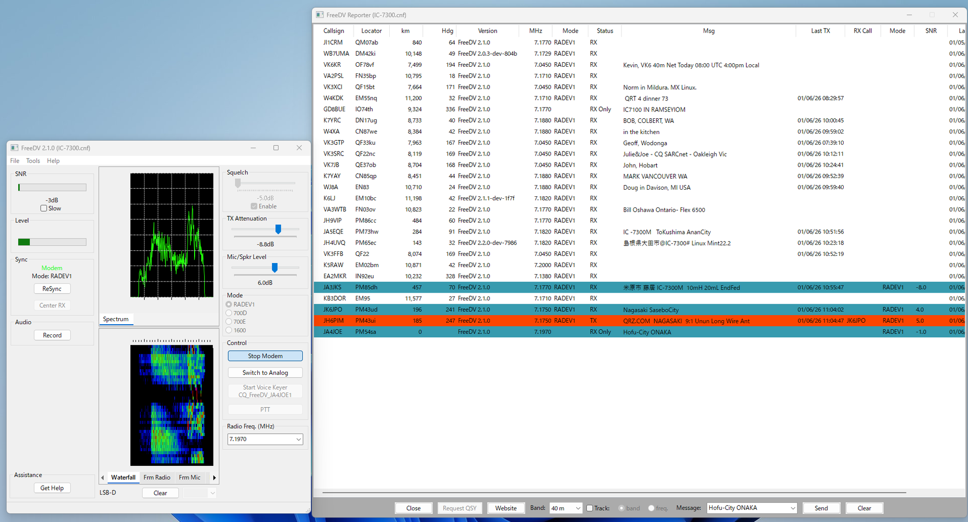 大阪のアクセスポイントを開いてFreeDVレポーターを見て、出ている局がいる周波数に合わせます。モードをLSBにします。