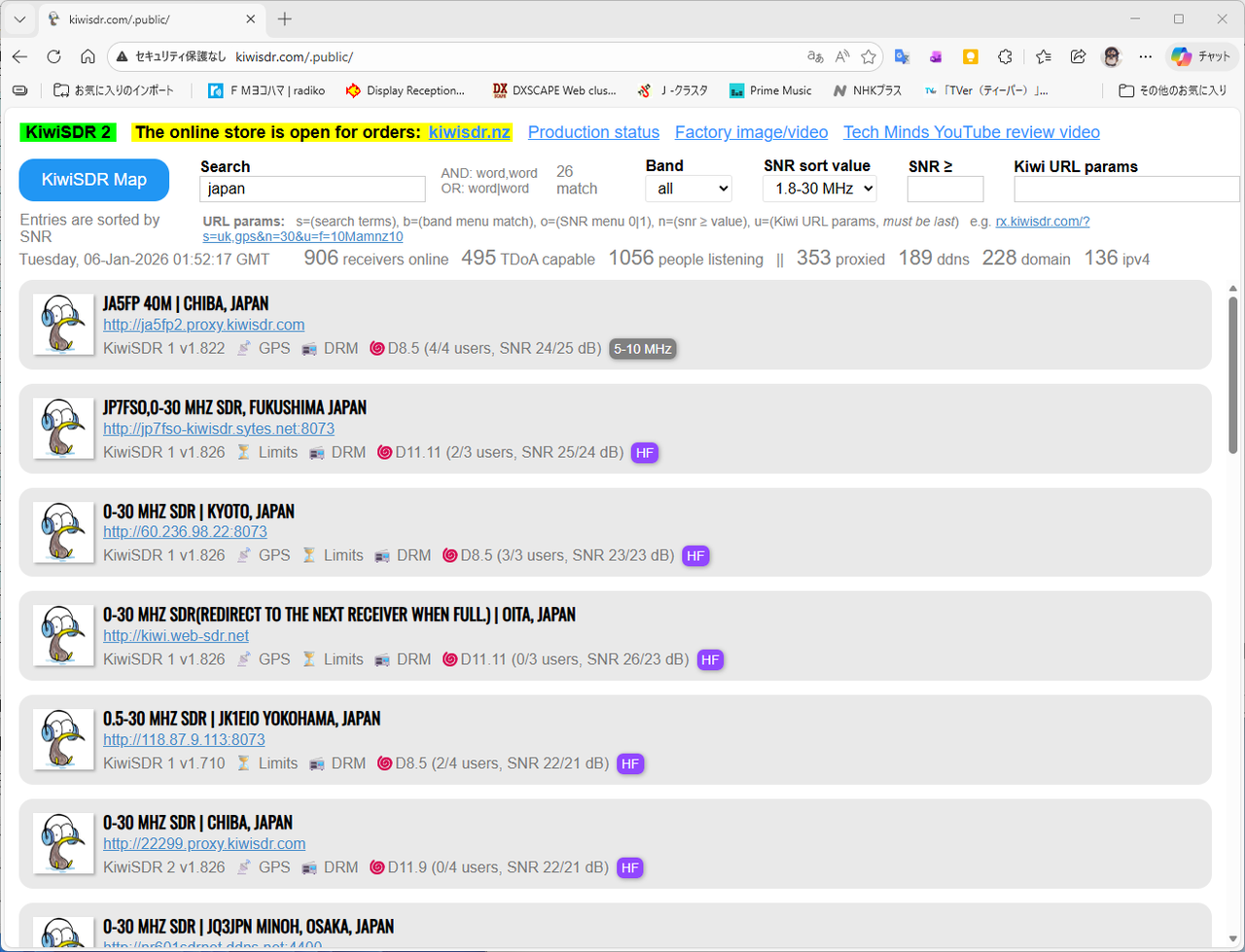 次にブラウザ(今回はEdgeを使用)から KiwiSDR Mapを開いて「japan」で検索して国内のKiwiSDRアクセスポイントを表示します。