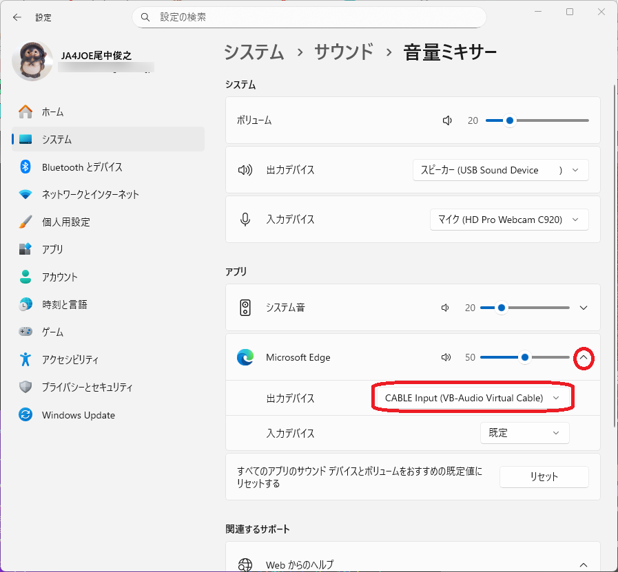 Microsoft Edge の出力デバイスをCABLE Input (VB-Audio Virtual Cable)にします。