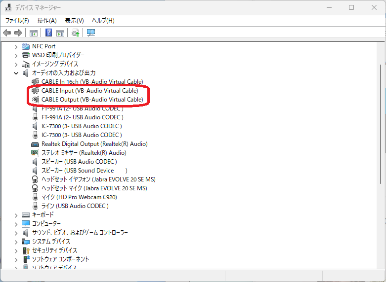 デバイスマネージャーで確認すると、CABLE Input (VB-Audio Virtual Cable)とCABLE Output (VB-Audio Virtual Cable)が出来ています。