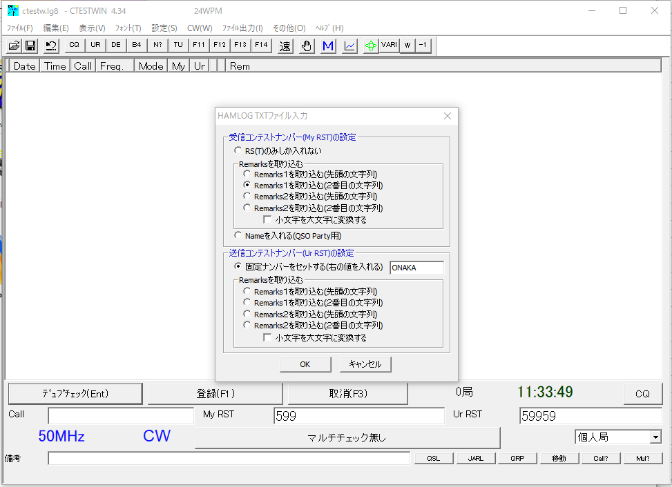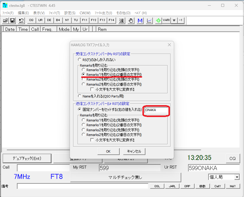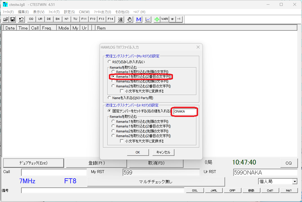 受信コンテストナンバーは、Remarks1に「NYP OP名」と書いているので、「Remarks1を取り込む(2番目の文字列)」を選んでOP名のみを取り込みます。送信コンテストナンバーは「固定ナンバーをセットする」に自局のOP名(私の場合 ONAKA)を設定します。
