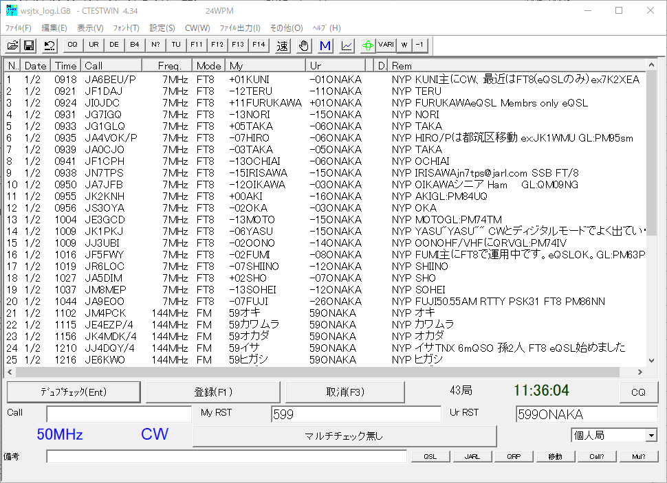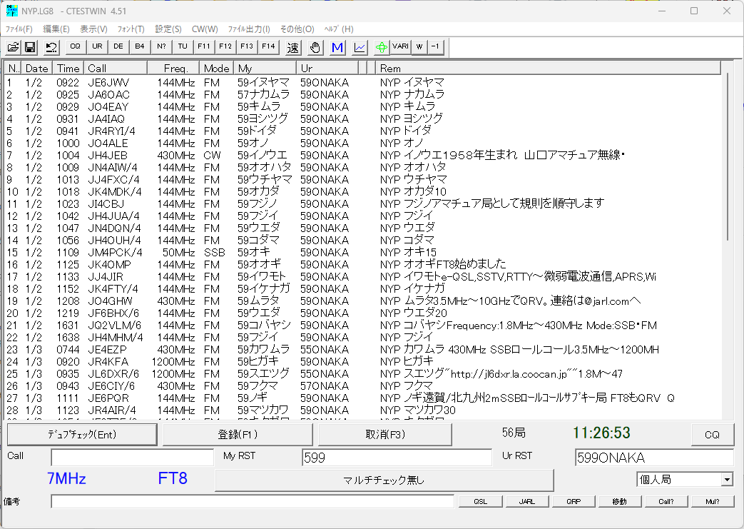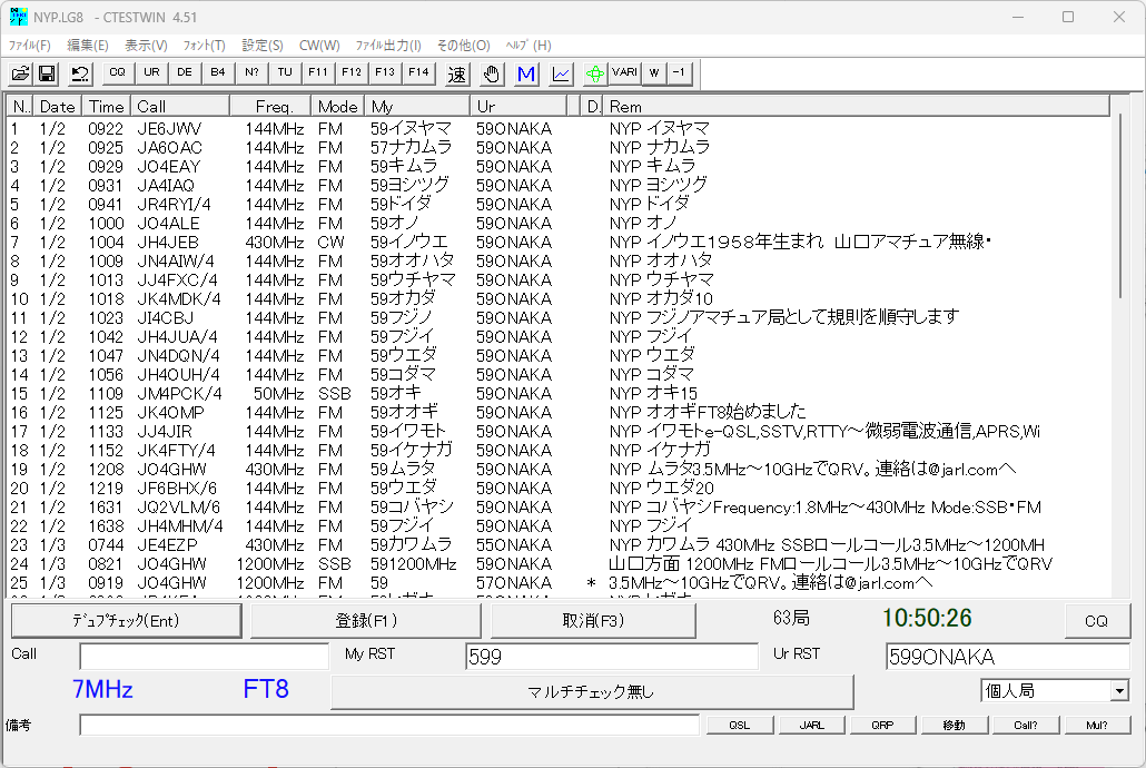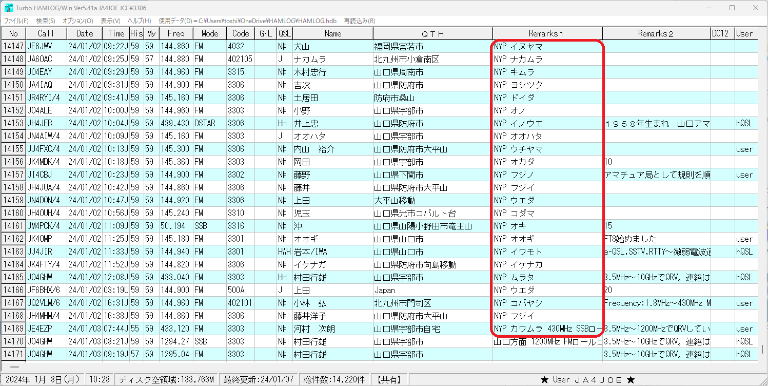 HAMLOGの入力は交信時にHAMLOGのRemarks1への相手オペレーター名の記入を「NYP OP名」にしてあります。(CTESTWINでName欄をオペレーターネームとして使う事も出来ますが、CWやFT8ではハンドルネームを送って来られるので、Name欄は使わずRemarks1に記録しています。)