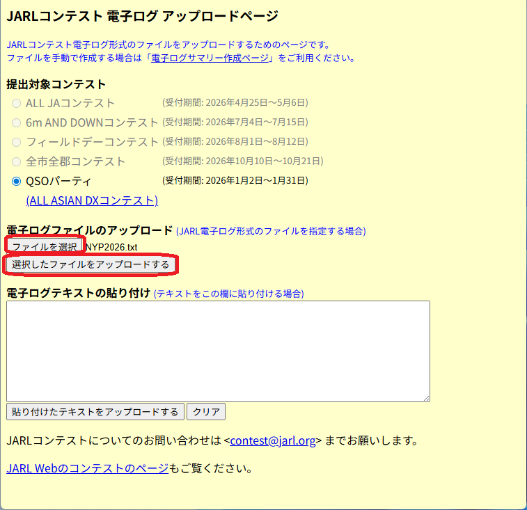 次にJARLの電子ログアップロードページから提出用ログファイルをアップロードします。