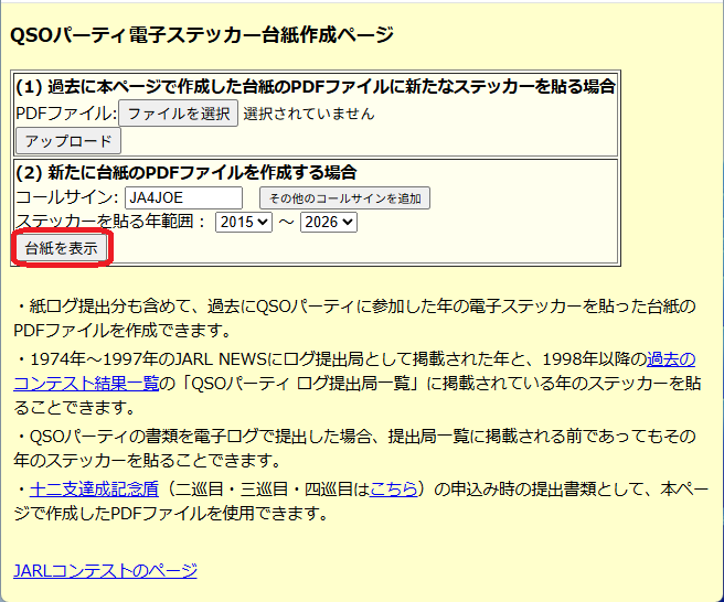 電子台紙で良い方はQSOパーティ電子ステッカー台紙作成ページから台紙にステッカーを貼る事が出来ます。