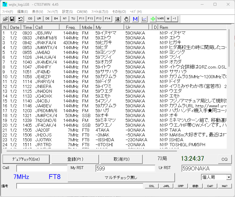 私の場合はQSOパーティーのログはCTESTWINにまずは入れております。特に今回はRTTYで出ているので、MMTTYとCTESTWINを連携させて運用しました。(他のコンテストもそうですCWだとDSCWと連携させています)ハムログには運用終了後CTESTWINの機能を使ってインポートさせております。こうすると途中でのQSO分を削除等も不要になります、但し、ハムログ側の時系列が若干前後することが出てきますが。またQSOパーティーも含めてコンテストではFT8は使わないのでこのようにできるのですが、この辺りは運用のモード、システム構成によってどちらが良いかがあるとは思います。