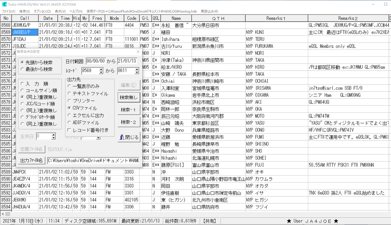 HAMLOGでQSOパーティー期間のレコード番号のログをCSVファイルで出力します。ファイル名は「NYP.csv」にしました。