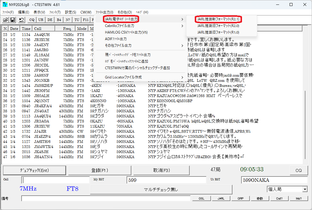 ファイル出力→JARL電子ログシート出力→JARL推奨新フォーマット(R2.1)