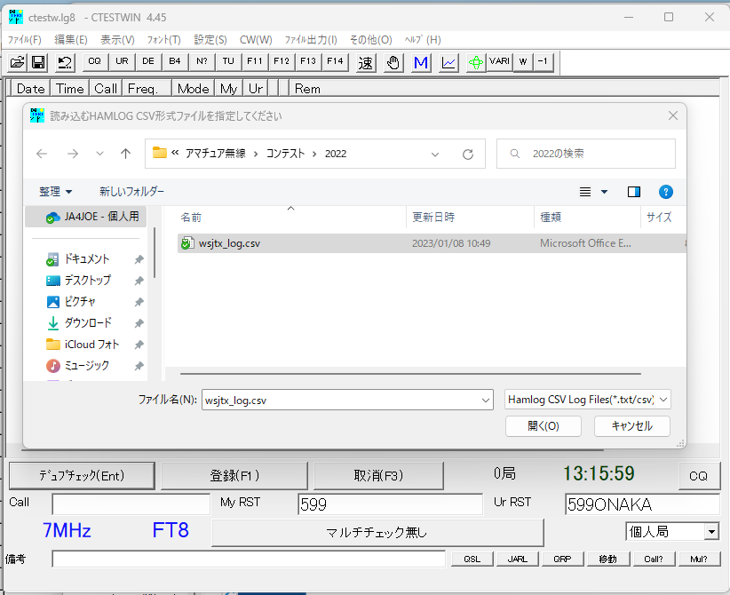 ファイル-->ファイルのインポートーー>HAMLOG CSVファイルを開く