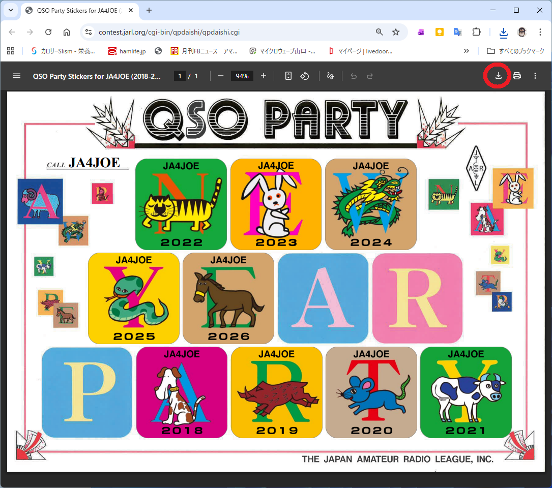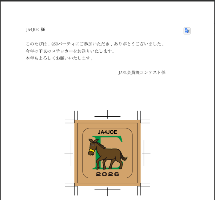 すぐにメールで「QSOパーティ ステッカー」が送られてきます。