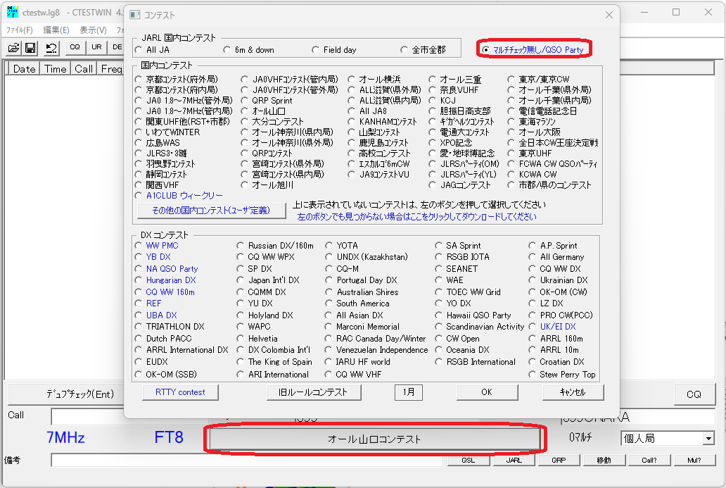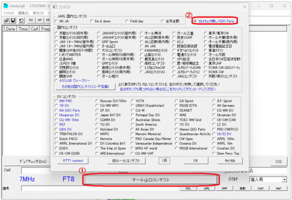 コンテストは②「マルチチェック無し/QSo Party」を選びます。