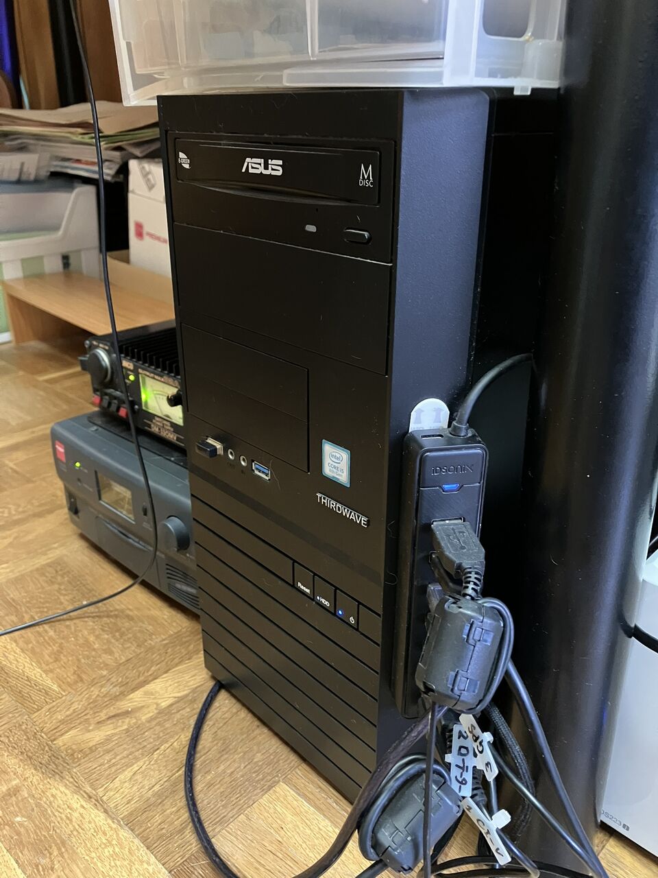 このパソコンはFT8用にUSBで無線機が3台つながっていて、他にもGPSとかQRコードリーダーなど、たくさんのデバイスがつながっています。モニターも3台つながっています。