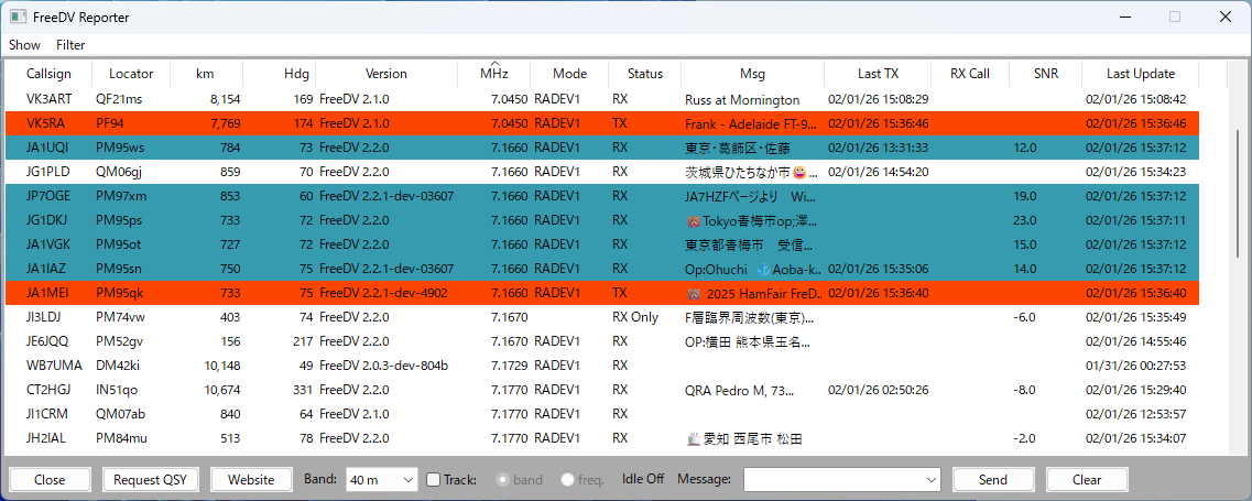 現在FreeDVをモニターしている局が表示されて、送信中の局が赤く表示されます。送信中の局を受信できている局は青く表示されて、受信SNRが表示されます。