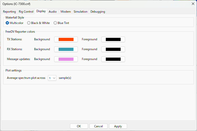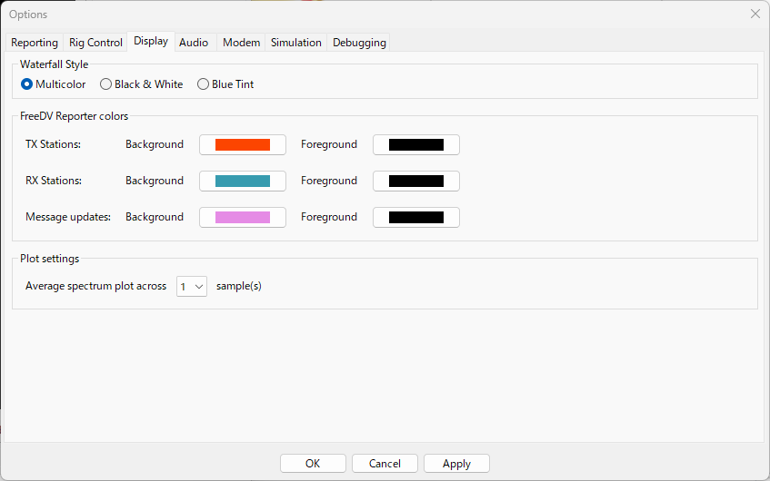 ウォーターフォールとFreeDVレポーターの表示色を設定できます。