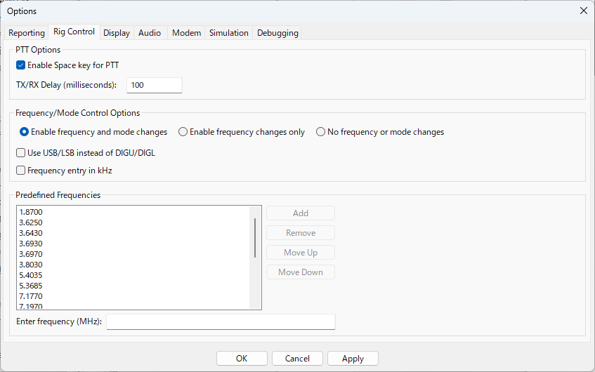 無線機の周波数とモードの自動切換えに関する設定です。[Enable frequency and mode changes]にしておきます。