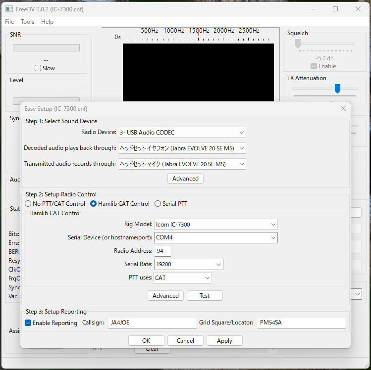 [Enable Reporting] チェックして、自局コールサインとグリッドを設定します。