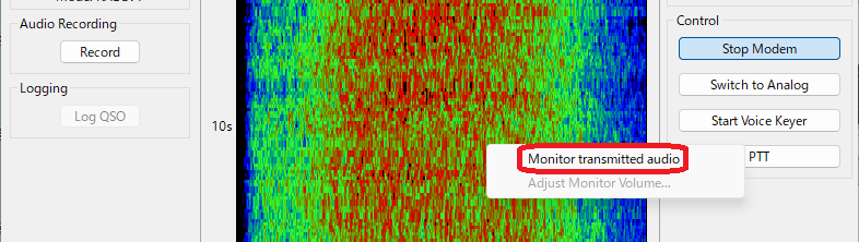[PTT] ボタンを右クリックして「Monitor tranmsmitted audio」をチェックします。
