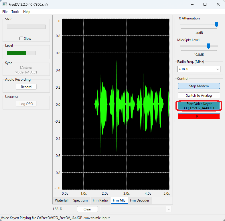 [SNR] 受信信号のSNRを表示します。RADEV1モードでは-3dB以下だときれいな音声の復調は厳しいです。0dBより上なら安定した音声が聞えます。(-2.5dB以下は音声が再生されません)[Record] 受信音声を録音出来ます。