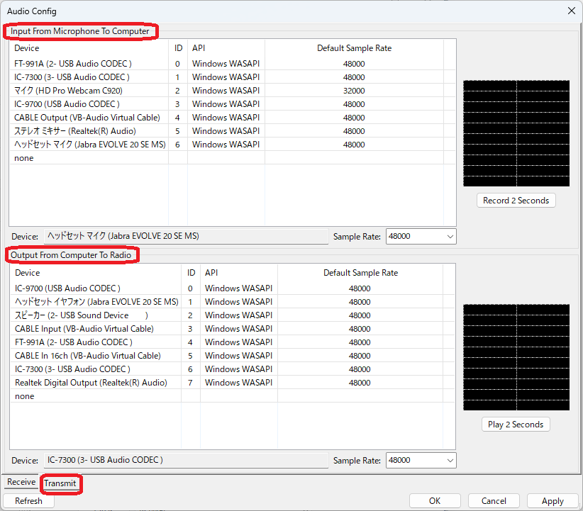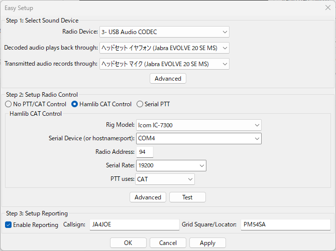 (注)パソコンに複数の無線機を接続していてUSB Audio CODECが複数ある場合は、目的のUSB Audio CODECを指定できない事があるようです。その場合は [Advanced] から設定してください。