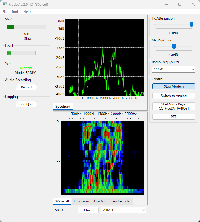 また、単なるデータモード(LSB-D or USB-D)で送信してみたときと、プリセットを呼び出して送信してみた時とで、FreeDVの画面のスペクトラムの波形が変わりませんが(full duplex時)、送信帯域幅が効いているのかどうかわかりません。