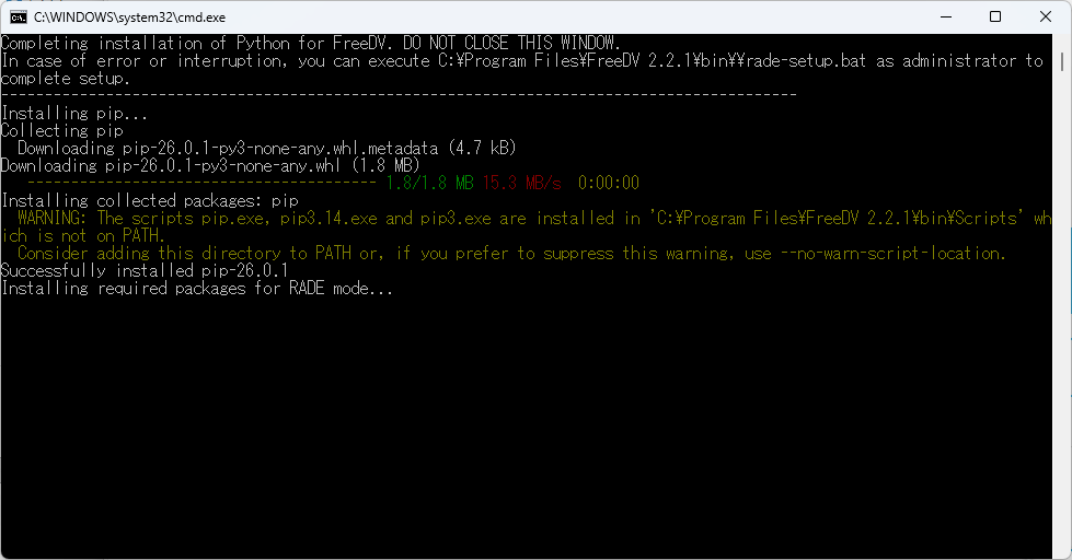 途中でコマンドプロンプトを閉じたせいかRADEのランタイムライブラリが壊れて、RADEモードで起動するとFreeDVが終了するという問題が起きるようになった事がありました。