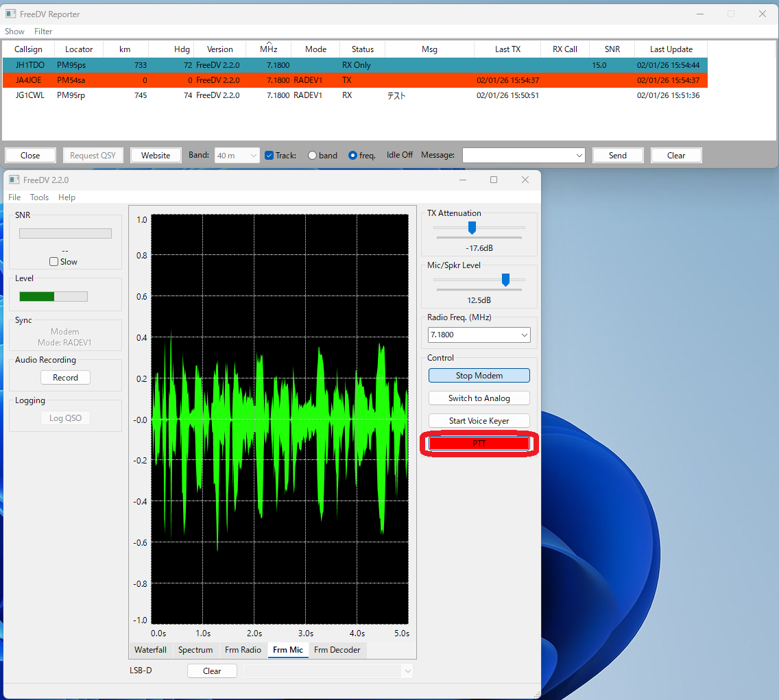 FreeDVの画面にある [PTT] ボタンはマウス操作が面倒で、上に別のアプリのウィンドウが重なると操作できなくなります。