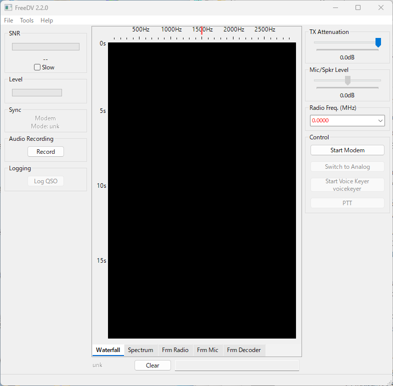起動直後のFreeDVメイン画面です。(最初の起動でEasy Setupの画面も表示されます。)