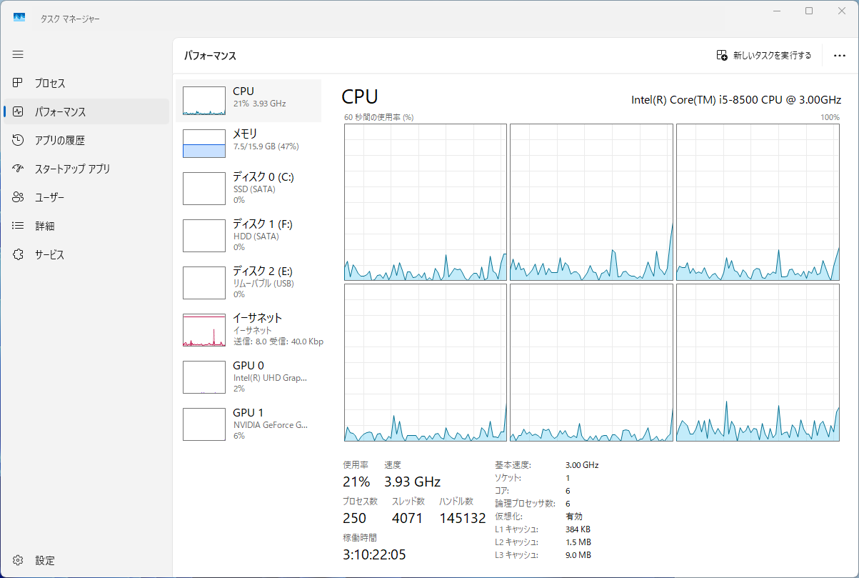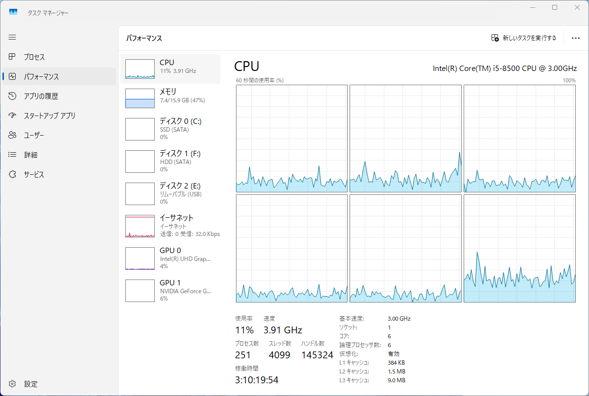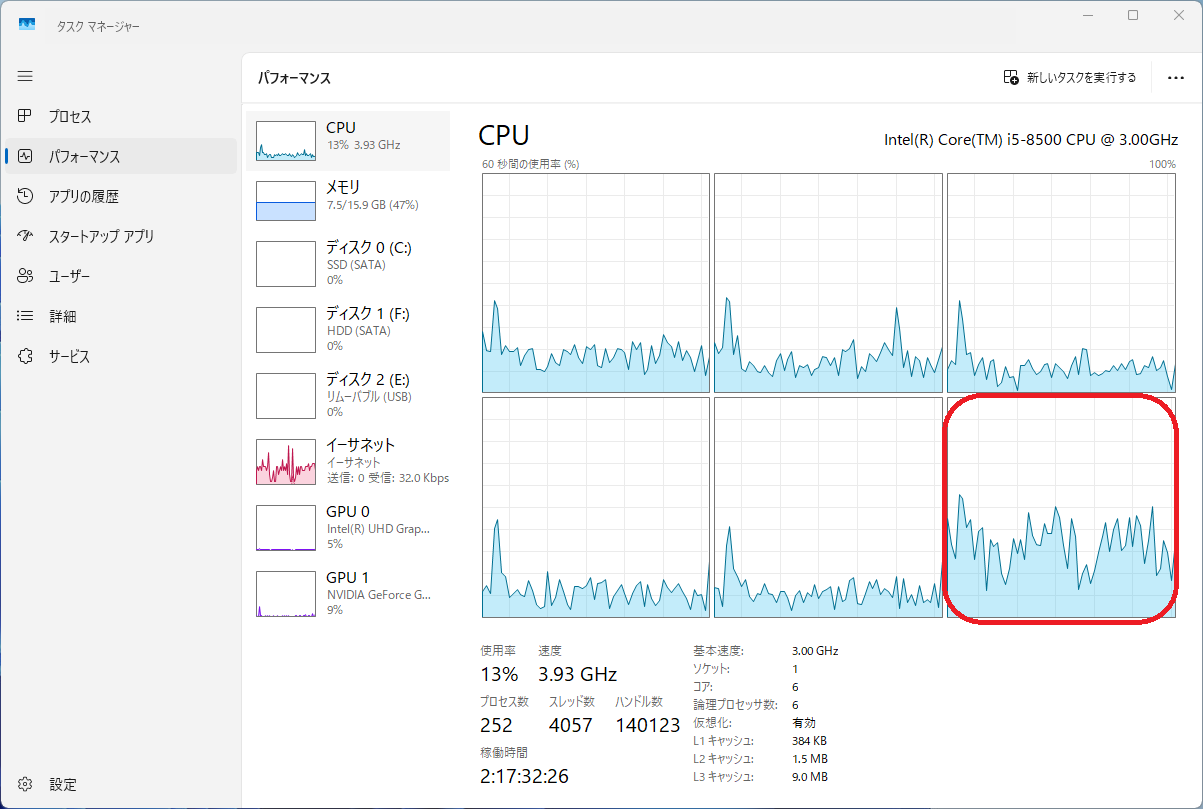 タスクマネージャーでCPUのパフォーマンスを見てみました。
