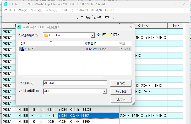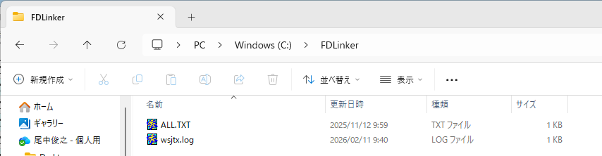 FDLinkerというフォルダーを作ってALL.TXTとwsjtx.logを置きました。WSJT-Xのログフォルダーからコピーして最後の数行だけを残したものです。