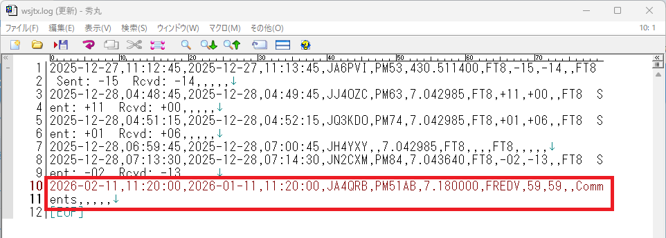 JT-Get'sが動いている状態で、エディターからwsjtx.logの最下行にFreeDVの交信ログを書いてみました。