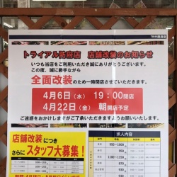 向島を出たところにあるトライアルにはお酒、ツマミ、猫おやつなどを買うので良く行っています。(^^;3週間前くらいから入り口に一時閉店のお知らせが掲示されていました。そして、昨日から閉店になりました。3週間も休みとはずいぶん長いですね。数日前に行った時は生鮮食品 ...