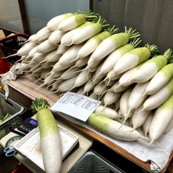 昨日、残っていたダイコンを約120本抜いて、今朝、直売所に出荷してきました。2股や腐りがあるものは捨てたり近所の方に差し上げたので、約90本を出荷しました。とりたて満菜のぶんです。これ以外に40本くらいイオン内直売所に出しました。3Lサイズ(1.6kg以上)ばかりですが、 ...