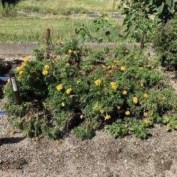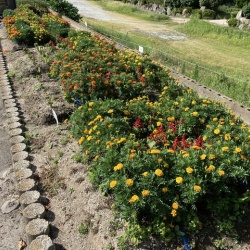 午前中、畑の帰りに自治会花壇の様子を見てきました。風で傾いている花がありますが、大きな被害はありませんでした。マリーゴールドが傾いたり倒れたりしています。ひどいところは起こしておきましたが、自力で起き上がると思います。先週、外側に倒れないようにヒモを張り ...